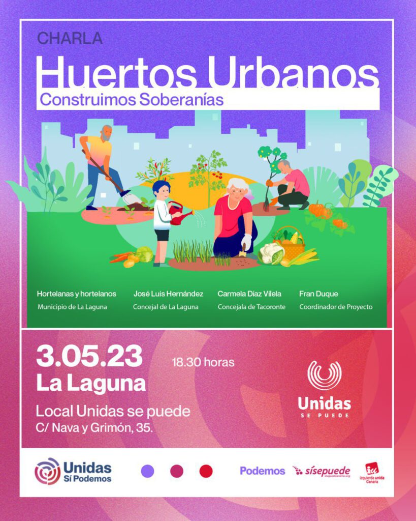 La coalición Unidas Sí Podemos y la confluencia municipalista de La Laguna, Unidas se puede, invitan a la ciudadanía de Tenerife a conocer la experiencia de los huertos urbanos impulsados por los gobiernos municipales de La Laguna y Tacoronte. De esta manera, tanto la coalición como la confluencia, –constituidas por Izquierda Unida Canaria, Podemos Canarias y Sí se puede– retoman el lema Construimos soberanías con el que esta última organización ha enmarcado otros encuentros a lo largo de la isla para abordar el papel transformador del municipalismo.