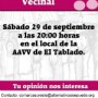 Dentro del calendario que está llevando la organización para visitar los barrios en busca de las demandas y necesidades de las vecinas y vecinos, el próximo sábado 29 de septiembre a partir de las 20:00 horas, tendrá lugar una nueva asamblea vecinal, en este caso en el barrio de El Tablado, en el local perteneciente a la asociación de vecinos.