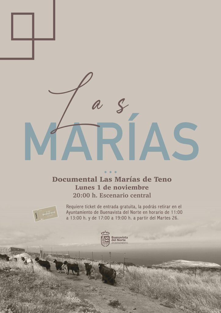 El Ayuntamiento de Buenavista proyecta el documental Las Marías de Teno, del director Daniel de León. La cinta recoge el testimonio de siete mujeres de las que poco se sabe más allá del caserío que las ha visto nacer y vivir a su manera. Ellas son María del Rosario Regalado o María de Los Dornajos; María del Carmen Verde Martín o María de Las Cuevas; María del Carmen González Martín o María Carmensa de La Tablada; María González Regalado o María de El Vallado; María Teresa Martín Regalado o María Teresa de La Zahorra; María Agustina Álvarez González o María de La Abejera, y María Rodríguez González o María de La Mesita.