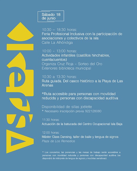 La inclusión es el eje central del diseño de todas estas actividades. Así, desde las 10.30 a las 18.30, una feria profesional inclusiva con la participación de asociaciones y colectivos de la Isla presentan al público su quehacer en la calle La Alhóndiga. Las actividades infantiles, con castillos hinchables y cuentacuentos, a cargo de Cruz Roja, habrán comenzado a las 10.00 y concluirán a las 13.00, en el exterior de la Biblioteca Municipal.