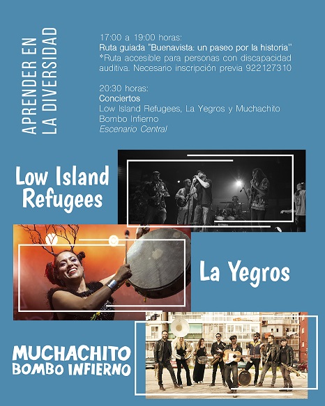 La sexta edición de Buenavista Diversa clausura su programa con el concierto de Muchachito Bombo Infierno, La Yegros y Low Island Refugees este sábado, 18 de junio, a las 20.30, en la plaza de Los Remedios de Buenavista del Norte. Con este acto de cierre se dará paso a un proceso de sistematización de conclusiones con las que el Ayuntamiento de Buenavista del Norte diseñará políticas públicas dirigidas a garantizar la inclusión y la diversidad, contenidos esenciales para la creación de una sociedad más democrática y acorde a la vida de todas las personas que la constituyen.