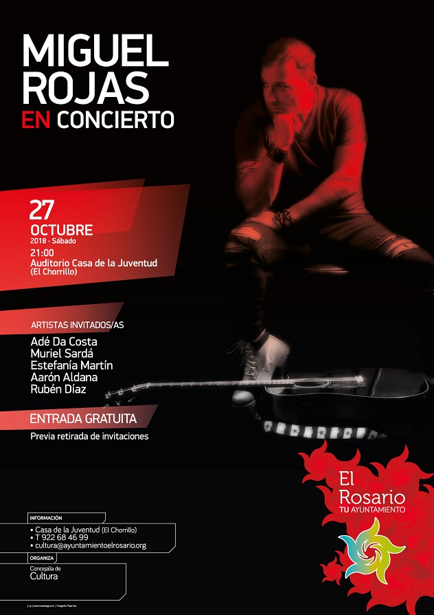 El Auditorio de la Casa de la Juventud de El Chorrillo acoge este sábado, 27 de octubre, a partir de las 21:00 horas, un concierto gratuito del cantautor Miguel Rojas. Dado que el aforo es limitado, las personas interesadas en asistir deberán retirar las invitaciones en la Casa de la Juventud en horario de 10:00 a 14:00 horas y de 17:00 a 20:30 horas, de lunes a viernes.
