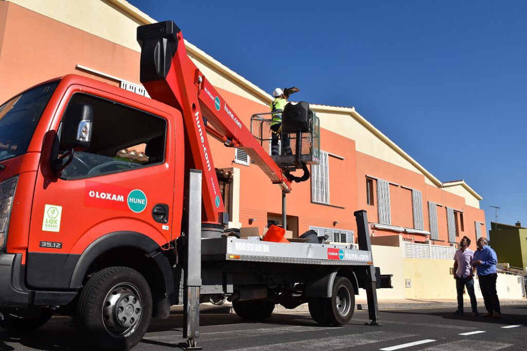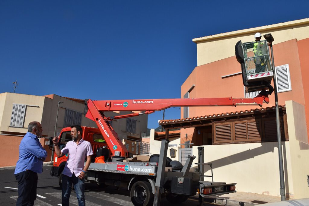 El Ayuntamiento de El Rosario ha comenzado a ejecutar la sustitución de un total de 1.534 luminarias públicas a tecnología led, renovando, además 31 cuadros de alumbrado público. Con esta medida, que beneficia al 46% de todos los puntos de luz presentes en el Municipio, se rebajará un 71% el actual consumo eléctrico y dejarán de emitirse 250 toneladas equivalentes de CO2 al año. Esta actuación cuenta con una inversión total de 1’3 millones de euros, de los cuales el 85% proviene de una subvención concedida por el Instituto para la Diversificación y Ahorro de la Energía (IDAE) del Ministerio de Transición Ecológica. El alcalde de El Rosario, Escolástico Gil, y el concejal de Transición Ecológica, Fidel Vázquez (Sí se puede), comprobaron recientemente el desarrollo de los trabajos que continuarán durante los próximos meses.