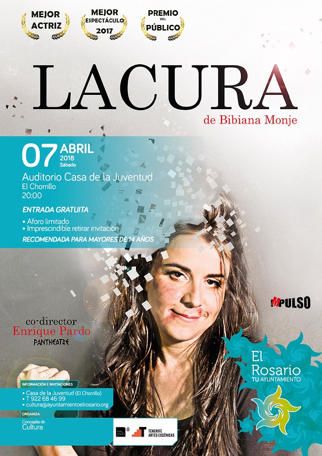 El Auditorio de la Casa de la Juventud de El Chorrillo acogerá el próximo sábado, 7 de abril, el espectáculo teatral «Lacura», de la compañía Impulso y protagonizada por la actriz Bibiana Monje. Esta obra resultó ganadora del Premio Réplica 2017 al Mejor Espectáculo, del Premio del Público y su protagonista logró, además, el Premio Réplica a la Mejor Interpretación Femenina, en la edición del pasado año de los premios del teatro y la danza de Canarias. La colaboración entre Tenerife Artes Escénicas y la Concejalía de Cultura, que dirige el edil Fidel Vázquez (Sí se puede), posibilitan esta función que, además, será gratuita. Las invitaciones ya pueden ser retiradas en la Casa de la Juventud, en horario de 10:00 a 14:00 y de 17:00 a 20:30 horas.