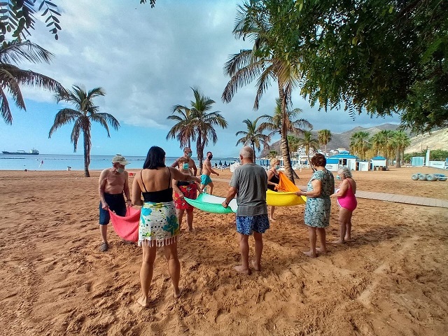 Los usuarios y usuarias del Centro de Día para personas mayores Acaymo de La Laguna han vuelto a disfrutar de las sesiones de terapia en la playa, tras muchos meses de restricciones en las actividades al aire libre por la pandemia. Con esta actividad  del Área de Bienestar Social, se favorece el uso del agua y de la arena para reforzar la psicomotricidad, la interacción positiva y mejorar la salud de las personas que acuden cada día a este servicio municipal.