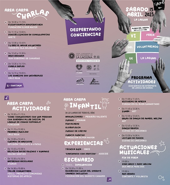 La Concejalía de Bienestar Social del Ayuntamiento de La Laguna promueve este sábado, 15 de abril, la VI Feria anual del Voluntariado del municipio, un espacio de encuentro entre la ciudadanía y 83 entidades y federaciones presentes en la localidad. Como una de las propuestas más multitudinarias de su tipo en las Islas, no solo busca visibilizar la labor que realizan estas organizaciones en los ámbitos de la discapacidad, la inclusión e integración social, el medio ambiente o la cultura en el municipio, sino también, sensibilizar a la población concentrando interesantes propuestas informativas y formativas de interés general, que ayuden a mejorar el conocimiento sobre la actividad de los colectivos en la mejora de la calidad de vida de muchas personas y con propuestas como un espacio de experiencias para la iniciación en la lengua de signos española (LSE) o el guiado de personas ciegas y sordociegas.
