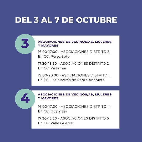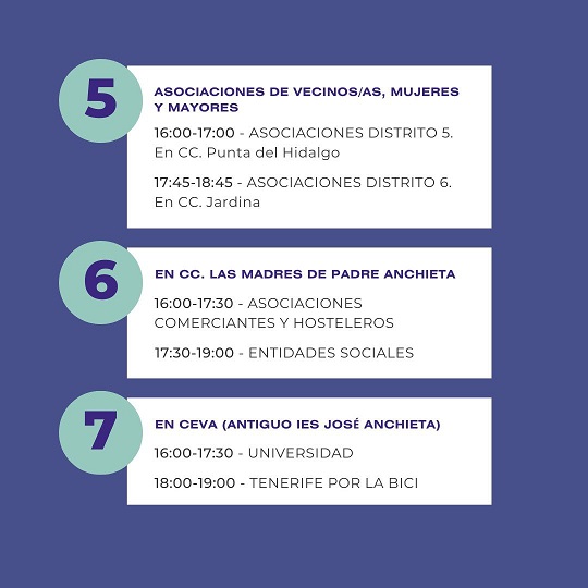 Esta nueva fase de trabajo comunitario, que se desarrollará la próxima semana, se desarrollará por distritos y colectivos. Así, el 3 de octubre, se convocará a las asociaciones vecinales, de mujeres y de mayores de los distritos 1 (Gracia, Casco, San Lázaro, La Vega Lagunera), 2 (La Cuesta, Finca España, Los Valles) y 3 (Las Chumberas, Geneto, Taco), mientras que al día siguiente, corresponderá a las de los distritos 4 (Los Andenes, Los Baldíos, Guamasa, El Ortigal, Los Rodeos), 5 (Bajamar, Punta del Hidalgo, Tejina, Valle de Guerra) y 6 (Jardina, Las Mercedes, Las Montañas, Vega de las Mercedes). Los días siguientes, las reuniones de trabajo incluirán a las asociaciones de ciclistas, comerciantes y hosteleros, así como la Universidad de La Laguna y las entidades sociales del municipio.