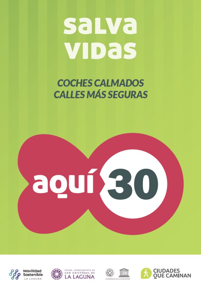El Área de Movilidad Sostenible del Ayuntamiento de La Laguna ha lanzado una campaña para visibilizar los valores de la iniciativa Ciudades 30, un primer paso informativo y una declaración de intenciones de la voluntad municipal de sumarse a este distintivo de calidad de la Red de Ciudades que Caminan, que va más allá de la limitación de la velocidad máxima a 30 km/ en las vías urbanas y que incluirá la adaptación de estos espacios para mejorar la seguridad y la convivencia vial de coches, peatones, bicicletas y vehículos de movilidad personal.