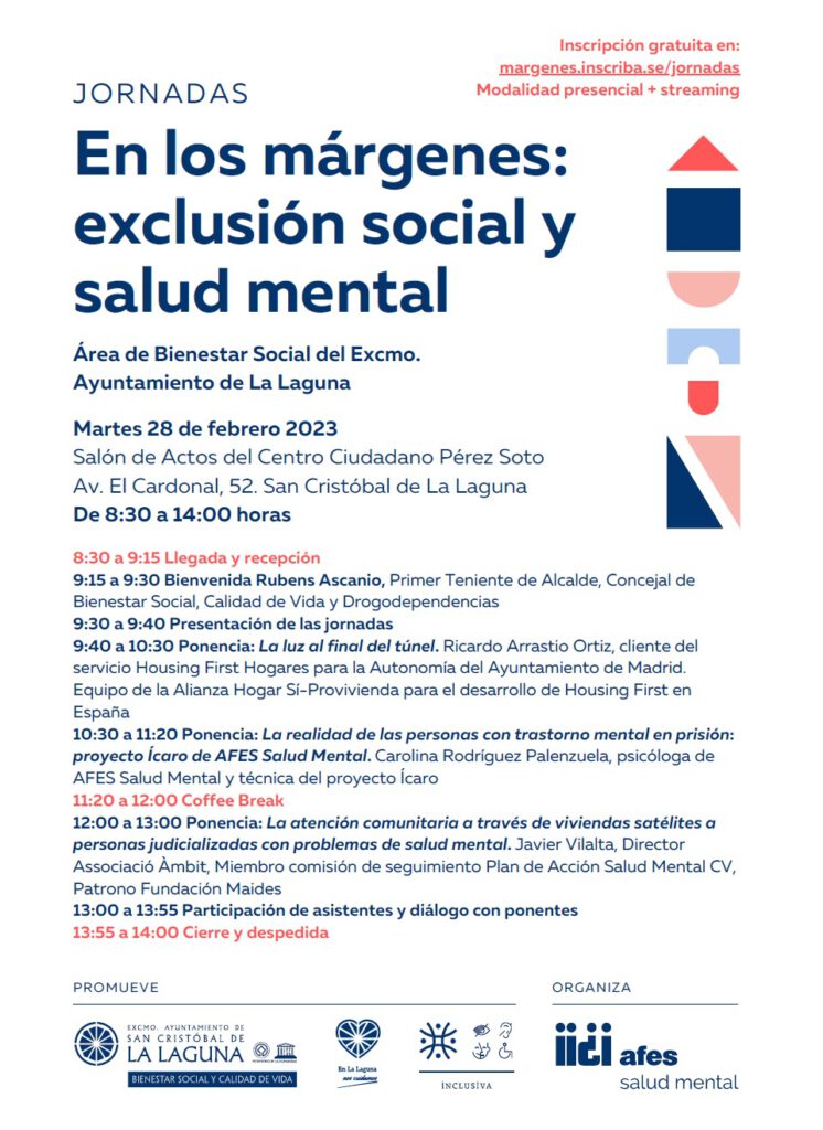 La Concejalía de Bienestar Social de La Laguna y AFES Salud Mental han vuelto a unirse para generar un espacio regional de análisis técnico sobre cómo influyen y se interrelacionan la exclusión social y la salud mental. La jornada profesional En los márgenes: exclusión social y salud mental se celebrará este martes (28 de febrero) con el objetivo de contribuir a desterrar mitos y mejorar la atención social que se presta en las Islas, todo con el apoyo de profesionales del sector, la participación de personas beneficiarias y el estudio de experiencias y programas innovadores que se están implantando en diversos puntos del país.