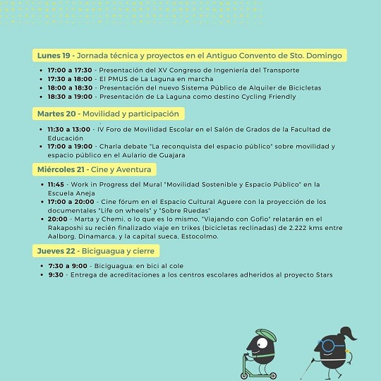 El programa de la SEM lagunera continúa el miércoles con un cinefórum en el Espacio Cultural Aguere y una conexión con Marta y Chemi, de “Viajando con Gofio”, que relatarán su recién finalizado viaje en trikes (bicicletas reclinadas) de 2.222 kms entre Aalborg, Dinamarca, y la capital sueca, Estocolmo. Al día siguiente, se celebrará la iniciativa Biciguagua, para fomentar los desplazamientos escolares en bici, y tendrá lugar la entrega de acreditaciones a los centros escolares adheridos al proyecto Stars.