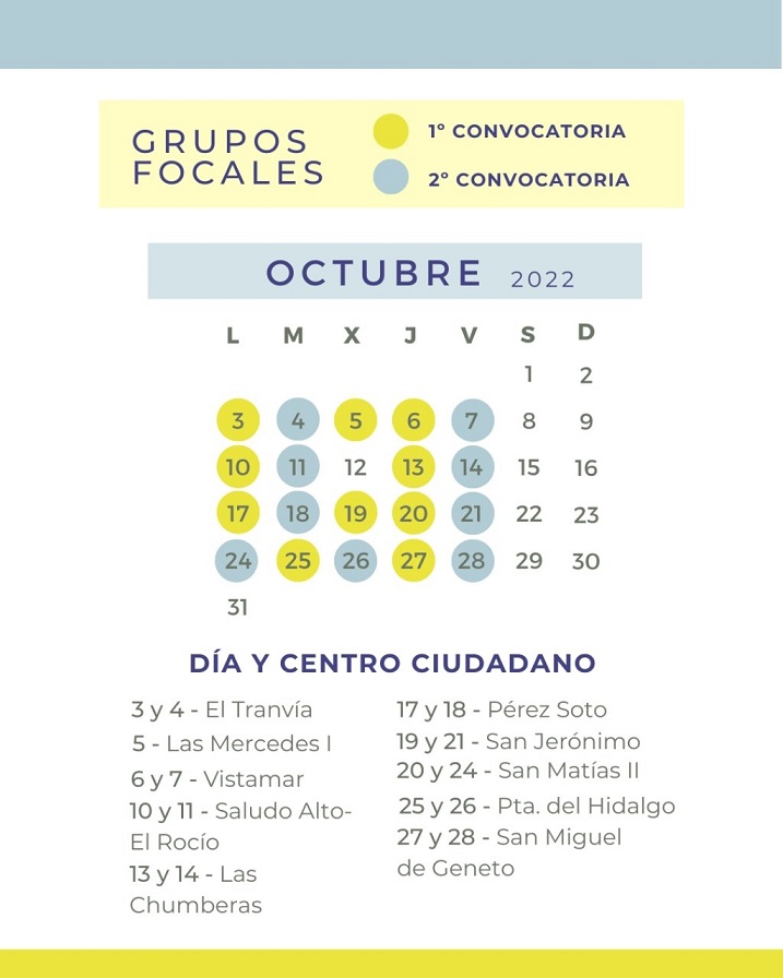 Los grupos de trabajo se celebrarán durante dos meses en los centros ciudadanos de todos los distritos, con dos jornadas en cada uno. Comenzarán el 12 de septiembre en Valle de Guerra y continuarán en los centros de Tejina, San Diego, Las Carboneras, Las Madres de Padre Anchieta, Gracia, El Batán, Finca España, El Tranvía de La Cuesta, Las Mercedes I, Vistamar, Salud Alto-El Rocío, Las Chumberas, Pérez Soto, San Jerónimo, San Matías II, Punta del Hidalgo y finalizarán, los días 27 y 28 de octubre, en San Miguel de Geneto.