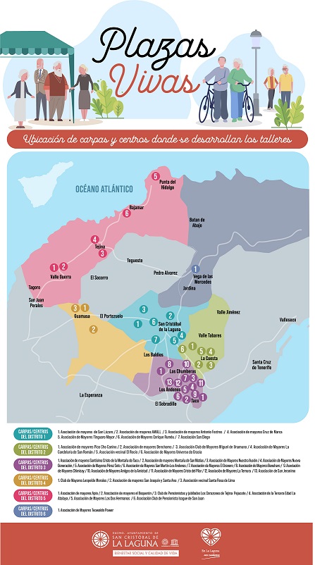 El programa de actividades para personas mayores Plazas Vivas regresa a los pueblos y barrios de La Laguna tras casi medio año de parón por las restricciones asociadas a la situación epidemiológica en el municipio. Esta iniciativa del Área de Bienestar Social, que cuenta con la colaboración de la Concejalía de Participación Ciudadana y la implicación directa de las asociaciones de mayores, comenzó el 24 de mayo y, hasta el 24 de julio, recorrerá las plazas y centros ciudadanos municipales con una gran oferta de talleres formativos y de ocio para luchar contra la soledad no deseada y reunir, con todas las medidas de seguridad, a personas que llevan más de un año sufriendo las peores consecuencias de la pandemia.