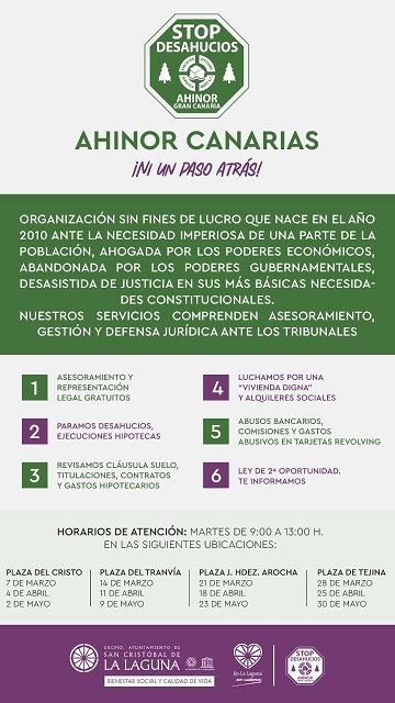 Esta iniciativa de la Plataforma de Afectados por la Hipoteca (AHINOR), que cuenta con la colaboración del Área de Bienestar Social del Ayuntamiento de La Laguna y está financiada por la Consejería de Derechos Sociales del Gobierno de Canarias, atenderá a quienes necesiten información, orientación y asesoramiento en relación con procedimientos judiciales derivados de ejecuciones hipotecarias, tarjetas revolving y productos financieros con cláusulas abusivas, pero también, en lo necesario para mejorar la propia gestión de la economía familiar y garantizar la cobertura de sus necesidades.