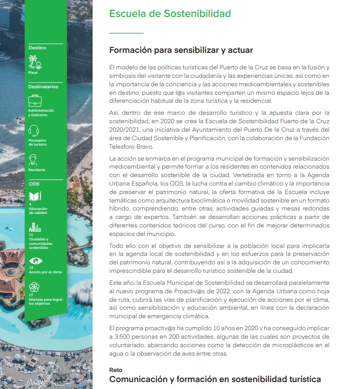 De los siete retos analizados por Segittur, la Escuela de Sostenibilidad de Puerto de la Cruz ha sido seleccionada como buena práctica por su labor en la comunicación y la formación en sostenibilidad turística. En concreto, se ha valorado su papel de transmisor de la importancia y los beneficios de la sostenibilidad a la comunidad local, así como su contribución a la comunicación eficaz de las acciones de sostenibilidad implementadas.