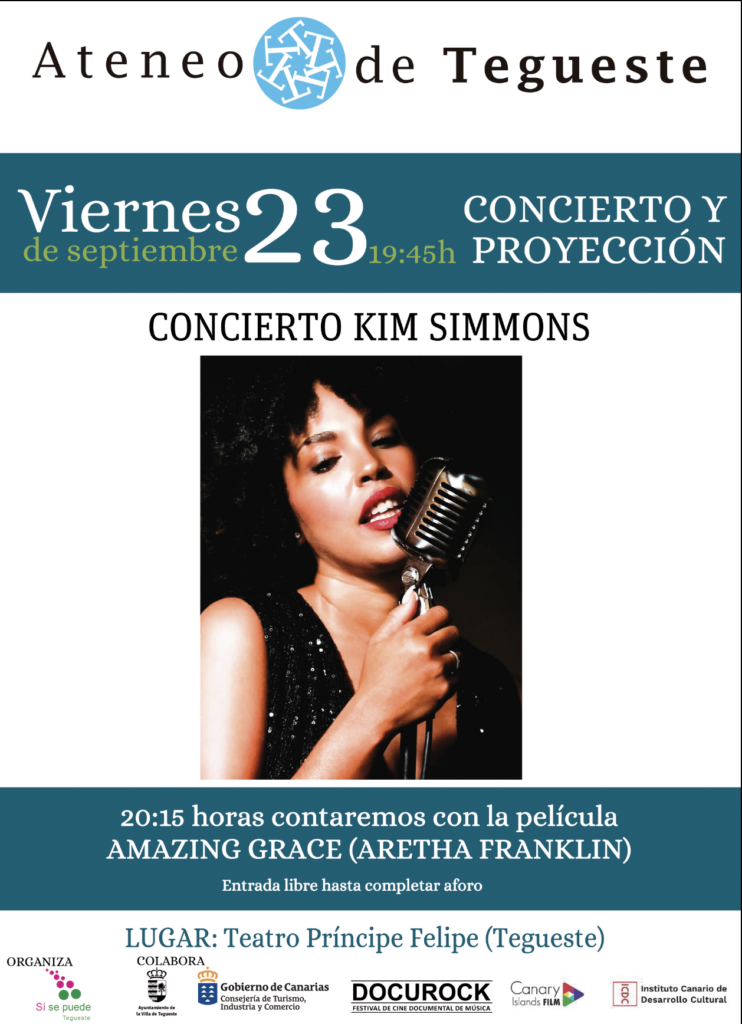 El Ateneo de Tegueste presenta el documental Amazing Grace, que muestra a Aretha Franklin en su mejor momento, durante la grabación de su disco de góspel que lleva el mismo título. La proyección está precedida por un concierto de la cantante hondureña Kim Simmons y el guitarrista Kiko Castro. Ambas acciones culturales se celebran el viernes 23 de septiembre, a partir de las 19.45, en el Teatro Príncipe Felipe del municipio, y forman parte de la programación de la octava edición del Festival DocuRock. La entrada es libre hasta completar aforo.