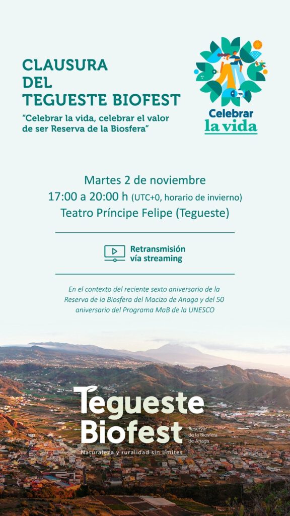 La primera edición de Tegueste Biofest se ha hecho coincidir con la conmemoraciónn del 50º Aniversario del programa de la Unesco Hombre y Biosfera (MaB- Man and the Biospher), que impulsa el valor de los espacios naturales únicos, como es el caso del macizo de Anaga, su conservación y su desarrollo sostenible a partir de la interacción con el hombre.